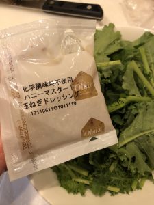 - 付属のドレッシングとケールを混ぜ合わせる。
