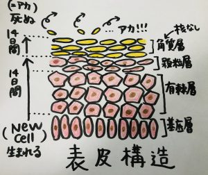 - 表皮の一番下(基底層)で生まれた新しい表皮細胞(赤ちゃん表皮細胞)は、成熟しながらどんどん上に押し上げられていき、最終的に扁平な形の細胞になり、死んで角質(垢)となる。この期間をターンオーバーという。(理想的には約28日間)