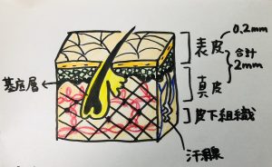 - 一番上から角質層→顆粒層→有棘層→基底層があり、これらをまとめて表皮という